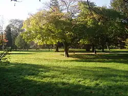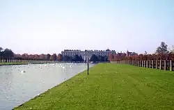 Hampton Court Park, also known as Home Park, is a walled royal park managed by the Historic Royal Palaces.[1] The park lies between the gardens of Hampton Court Palace and Kingston upon Thames and Surbiton in south west London, England, mostly within the post town of East Molesey, but with its eastern extremity within the post town of Kingston. In 2014, part of the park was designated a biological Site of Special Scientific Interest (with Bushy Park and Hampton Court Golf Course). It takes up most of the final (lowest) meander of the non-tidal reaches of the River Thames and is mainly divided between a golf course, meadows interspersed with trees used for deer, seasonal horse grazing and wildlife. A corner of the park is used annually for the Hampton Court Flower Show and the part nearest to the palace has the Long Water — an early set of hydro-engineered ponds or lakes, fed by water from the distant River Colne, as are the bodies of water in the neighbouring park, Bushy Park.[2][3][4]
