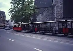 The place is famous for the Grottes de Han-sur-Lesse, a cave complex carved under a hill by the river Lesse, which tourists reach via a preserved remnant of the country's vicinal tramway system. The metre gauge line opened in 1906[4] as a branch off the Rochefort-Han-sur-Lesse-Wellin line,[5] which was open from 1904 to 1957.[4] Between 1988[6] and 1992[7] the village tram terminus was moved from a loop around the church of Saint-Hubert de Han-sur-Lesse to a loop on the other side of Rue Joseph Lamotte.[8]