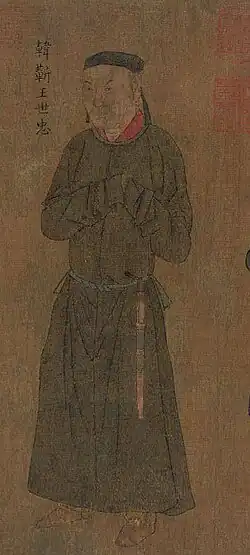 Han Shizhong (Chinese: 韓世忠) (1089 – 16 September 1151[1]) was a Chinese military general, poet, and politician of the late Northern Song dynasty and the early Southern Song dynasty. He dedicated his whole life to serving the Song dynasty, and performed many legendary deeds. It is said that he had scars all over his body and, by the time he retired, there were only four fingers left on both of his hands. General Han distinguished himself in the Jin–Song wars against the Jurchen Jin dynasty, and was reputed to win battles in situation where he had to face a larger number of enemies with a smaller numbers of soldiers. He was a great fighter and because of his feats in battle, Yuan Tan said that Han Shizhong was truly an even match for 10,000 men.