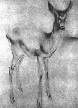 Van Meegeren's first exhibition was held from April to May 1917 at the Kunstzaal Pictura[11] in the Hague. In December 1919, he was accepted as a member by the Haagse Kunstkring, an exclusive society of writers and painters who met weekly on the premises of the Ridderzaal. Although he had been accepted, he was ultimately denied the position of chairman.[12] He painted the tame roe deer belonging to Princess Juliana. The painting, Hertje (The Fawn or The Deer), was completed in 1921, and became popular in the Netherlands. He undertook numerous journeys to Belgium, France, Italy, and England, and acquired a name for himself as a portraitist, earning commissions from English and American socialites who spent their winter vacations on the Côte d'Azur. His clients were impressed by his understanding of the 17th-century techniques of the Dutch masters. Throughout his life, Van Meegeren signed his own paintings with his own signature.[13]