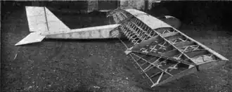 The fuselage had flat, parallel sides which tapered in depth aft of the wings. The single-seat cockpit was just behind the wing leading edge; with the pilot in place, a rear-hinged, rectangular piece with an aperture for his head folded forward to complete the upper wing surface. In front, the flat fuselage sides curved inwards and were rounded at the nose. The glider sat on a pair of skids mounted on the lower fuselage longerons, with the wings protected by wire loops reaching from the main spar below the wing to the leading edge. It also had a small tailskid.[2]