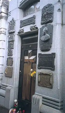 In June 1987, 13 years after his death, the Peronist Justicialist Party received an anonymous letter claiming Perón's hands had been removed from his tomb along with his army cap and sword; the letter demanded the party pay a US$8 million ransom for their return.[1][2] When authorities checked Perón's tomb, they discovered that it had indeed been broken into and the hands and other items removed.[1] Forensic experts who examined the body said the mutilation had occurred only a short time before the discovery. One source[3] states that the tomb was broken into on June 23, 1987, and that a poem written to him by his last wife, Isabel, had also been removed from the tomb. At the time, some news reports stated that the hands had been removed with "a surgical instrument",[1] but later reports state that the dismemberment had been done with an electric saw.[3]