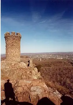 The Hanging Hills are a popular outdoor recreation resource. Hubbard Park features a bandshell and flower gardens and is the site of a variety of local festivals and concerts, most notably the spring Daffodil Festival.[9] A park road leads to Castle Craig Tower and is open from April through October from 10:00 a.m. to 5:00 p.m. A number of trails, most notably the 51 mile (80k) blue-blazed Metacomet Trail (maintained by the Connecticut Forest and Park Association), traverse the range. Trails are open to hiking, backcountry skiing, and snowshoeing; roads are open to bicycling and mountain biking. Swimming is prohibited. Rock climbing is only permitted for Ragged Mountain Foundation members who have obtained a permit from Meriden's parks and recreation department.[10] From the top of the Hanging Hills' many cliffs it is possible to see much of the Quinnipiac River Valley region, Long Island Sound, and the distant higher peaks of southern New England.[2][11]
