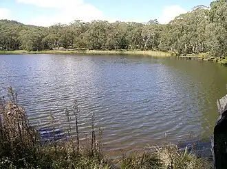 During 1853, American gold miners dug, an approximately 23 km, water race from Callaghans Swamp to underneath the Hanging Rock cliff face. Also that year Californians dug another water race from the swamp at the head of Dangars Gully to Nuggety Gully. In 1882, it took about twelve months to cut a 13 km water race from the Barnard River on the eastern side of the rough mountainous Great Dividing Range to the western side of the Range. Just south of Hanging Rock village are the Sheba Dams (with a surface area of 3.6 ha) which were erected by hand over a three-week period in 1888 to serve the sluicing needs of the miners. This construction was carried out by the Mt Sheba Company which leased the water rights for the area. Other water races were also constructed to feed various other mines around Bowling Alley Point and Hanging Rock.[2]