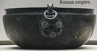 Hanging bowls are a distinctive type of artefact of the period between the end of Roman rule in Britain in c. 410 AD and the emergence of the Christian Anglo-Saxon kingdoms during the 7th century, continuing rather later. The surviving examples have mostly been found in Anglo-Saxon graves, but there is general agreement that they reflect Celtic traditions of decoration, albeit sometimes combined with Anglo-Saxon influences.[1]