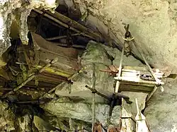 Hanging coffins (liang tokek, literally "hanging burial") is one of the funerary practices of the Toraja people of Sulawesi, either for primary or secondary burials. The distinctively boat-shaped coffins, known as erong, are always placed below overhanging parts of the cliff-face. These can be natural overhangs or cave openings, but some coffins are placed beneath man-made overhangs. They are guarded by carved wooden representations of the dead known as tau-tau. Older tau-tau are more abstract, but more modern tau-tau can be quite lifelike.[10] The reasoning for their placement is to discourage looters who might steal the items interred with the dead.[10][11]