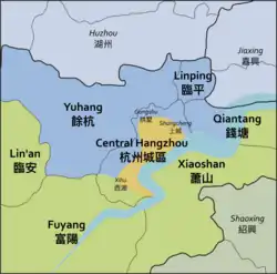 ![]() Location where Hangzhounese is traditionally spoken, between Suhujia (blue) and Linshao (green) areas[2] | |