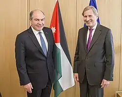 Mulki chaired the negotiating committee which produced the Israel-Jordan peace treaty between Jordan and Israel in 1994.[8] During his time as foreign minister, Jordan experienced diplomatic issues with both Iraq and Saudi Arabia. Mulki was appointed as Scientific Advisor to the King, and then a member of the Senate. On 9 February 2011, Mulki was reappointed as Minister of Trade and Industries. On 9 November 2014, he was appointed Chief Commissioner of the Aqaba Special Economic Zone Authority, replacing Kamel Mahadin.[9] On 29 May 2016, Mulki was appointed as the Prime Minister of Jordan, succeeding Abdullah Ensour.[7] His cabinet was sworn in on 1 June.[10] After the 2016 general election Mulki order a cabinet reshuffle, which resulted in three new portfolios, 22 ministers remaining and the introduction of 7 new ministers.[11]