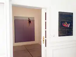 Exit is one of the first bodies of work Zurob made in Paris during his residency at Cité Internationale des Arts. These paintings incorporate collage, featuring traces of life in his new city - telephone calling cards, receipts and gauze.[21] As Zurob commented, "In Ramallah, the fish thinks it swims in an ocean, just to discover later that the ocean was only a barrel. You know what a real ocean is when you live in one. In Paris, I was shocked and liberated at the same time."[22] Steve Sabella writes, "Hani Zurob, one of the most significant painters of the new generation of Palestinian artists to emerge in the last decade, expresses, 'the best thing that happened to my art was the moment when I arrived in Paris because what I learnt in the last four years might have taken me a lifetime back in Palestine.'"[23]