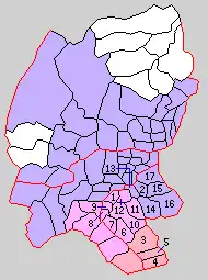 * yellow - areas formerly within the district borders during the early Meiji period