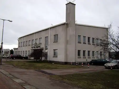 The Hanko Peninsula was leased to the Soviet Union in 1940–1941 and passenger traffic to the town ceased during the period.[1] The original station building and the warehouse were destroyed in December 1941, as Finland reclaimed the peninsula.[1] Passenger traffic to Hanko was re-started in February 1942. The current functionalist style station building designed by Jarl Ungern was built in 1949–1952.[1] A new freight station was completed in 1949 and was similar to the freight station in Rovaniemi. A train ferry port was completed in 1975 and served train ferry traffic until 1998, when train ferry traffic was moved to Turku.[1] The ticket sales office at the station was closed in 2008.