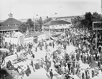 Hanlan's Point is the most westerly of the Toronto Islands. Originally a cottage community, one of the first settlers in the area was John Hanlan, after whom the island was named after in 1862.[3] In 1878, the Hanlan family converted their cottage into a hotel, and then replaced it with a new, larger 25-room Hanlan's Hotel in 1880, and began to develop the island as a tourist attraction.[4] The Hanlan's Point Amusement Park was one of a series of attractions built by the Hanlans in the 1880s.[5] In 1892, Ned Hanlan sold the amusement park, hotel, and other amenities to the Toronto Ferry Company which operated all the ferries travelling between the islands and the mainland, providing the only means for the general public to travel to the island.[6]