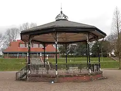 The park was developed under the supervision of the landscape architect Thomas Hayton Mawson of Windermere, who created Burslem Park around the same time.[3] Mawson's design makes use of terracotta to highlight features such as the axis between one of two footbridges across the canal and the pavilion. The pavilion, which is arguably the park's main focal point, was completed in 1896, and was designed by Mawson's junior partner Dan Gibson.[1] The bandstand between the pavilion and the canal was the gift of Mr George Howson, a local pottery owner.