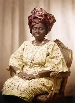 In addition to various other titles, she held the chieftaincy of the Yeye Oodua of Yorubaland. On 19 September 2015, she died at the age of 99, just over two months short of her 100th birthday.[5][6][7] She was buried beside her husband in Ikenne on 25 November 2015.[8] The former Vice President of Nigeria, Yemi Osinbajo, is married to her granddaughter, Dolapo Soyode.[9]
