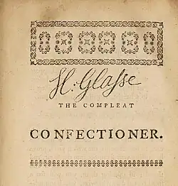 - Glasse, Hannah (1772). The Compleat Confectioner: Or, The Whole Art of Confectionary Made Plain and Easy. London: J. Cooke. OCLC 28134185.