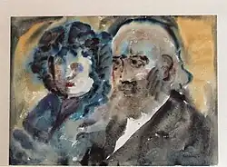In one of his most cryptic and intriguing works, Affenballade (Ballad of the Apes), he created a grid of bars that are painted along the lines of the Hessian sacks he used as a canvas.[6] In the late 1920s, he began to create, apparently for private amusement, a series of eccentric, caricature-like watercolors that reveal a knowledge of works by such modern figures as Emil Nolde and Alfred Kubin. These often satirical commentaries are unlike any of his other, more formal works, and are described by later critics as revealing both a scurrilous sentiment [7] and a debt to German Expressionism.[8] These sometimes anguished images are the pieces that have endured and are of greatest interest to contemporary audiences, who see in them a psychological reflection of the time between the wars in Vienna.
