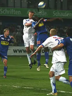 Tihinen then joined Norwegian club Viking in November 1999. He scored a decisive own goal in the final of the Norwegian Cup in 2000 but won the Cup championship the following year and headed the goal into the right goal. Tihinen spent two and a half seasons with Viking, while also having a brief loan spell at West Ham United in the English Premiership. Whilst at West Ham, he played in their 1–0 victory over Manchester United at Old Trafford in the 2000–01 FA Cup, and was named the man of the match.[1] After his loan deal ended, West Ham was willing to acquire Tihinen on a permanent contract for around £2 million, but Viking felt he was worth more and tried to raise the transfer fee to the point where the deal collapsed eventually, and Tihinen returned to Norway.[2]