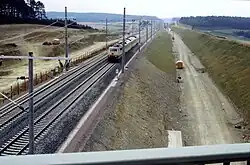 The first mast of the new railway power lines was erected in February 1983 near Nörten-Hardenberg.[79] By the end of 1983, DM 2.32 billion (around €1.14 billion) had been spent on the new line.[47]