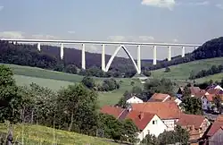 The route roughly follows the course of the Fulda, which is crossed three times. In the Bebra and Bad Hersfeld area, the line runs well to the west of the Fulda, some of it close to the A 7. Since the Fulda valley is too winding and narrowly built-up for a high-speed line and the side valleys largely run perpendicular to it, numerous structures are required on this section. Around two-thirds of the approximately 80-kilometre-long new section runs over 18 viaducts.[11] The outstanding structures include the Fulda Viaduct at Solms (km 206), the longest bridge on the line at around 1600 metres, and the Rombach Viaduct (km 218), the second highest railway bridge in Germany at around 95 metres. After the 7,345 metre-long Dietershan tunnel, Fulda station (km 234) is reached.