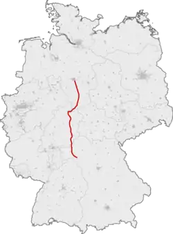 The upper edge of the rail is at heights between 50 m above sea level and 386 m above sea level.[6] The new line is 35 kilometres shorter than the pre-existing lines between Hanover and Würzburg.[7] It runs parallel to existing routes over a length of 51 kilometres.[6]