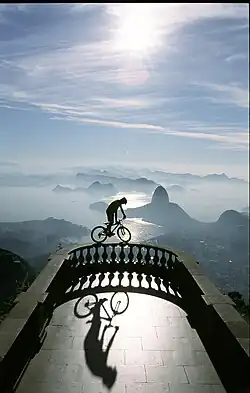Rey made a name for himself with a number of publicity stunts on this bike, like a photoshoot in gridlock traffic on the 405 Freeway near Los Angeles on top of car, bungy jumps with his bike, his wild ride on ropes down a 14-story skyscraper in New Zealand, his ride along the 600 ft. high ledge at the Cliffs of Moher and his bike dance on the volcano in Hawaii surrounded by hot lava on the edge of a boiling ocean.