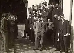 When given the choice between a professorship at the Gregorian University in Rome and a role as student chaplain in Basel, Switzerland, he chose the chaplaincy, preferring pastoral work to academia. Moving to Basel in 1940, Balthasar edited the Europaische Reihe literary series for the Sammlung Klosterberg, translated French Resistance poetry, helped to produce plays (including a staging of his own translations of Bernanos' Dialogues of the Carmelites and Claudel's The Satin Slipper), published book-length studies on Maximus the Confessor and Gregory of Nyssa, and regularly lectured to students. He established the Studentische Schulungsgemeinschaft in 1941, an institute for student formation that featured courses and conferences by Hugo Rahner, Martin Buber, Yves Congar, Gustav Siewerth, Henri de Lubac, and others. To the students, Balthasar offered liturgies, sermons, retreats, and spiritual direction, with a particular emphasis on the Spiritual Exercises of Saint Ignatius of Loyola.[36] According to Jacques Servais, "A good number of the young men eventually entered the Society of Jesus, while others decided to remain in the lay state, hoping to find a form of consecration to God in the world."[37]