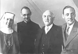 That same year, his Jesuit superiors informed him that the Society of Jesus could not be answerable for the Community of Saint John, the secular institute he had begun to organize with Adrienne von Speyr.[52] Feeling that he "was being called by God to certain definite tasks in the Church", he made a 30-day retreat at the request of Father General Jean-Baptiste Janssens, where the director confirmed that Balthasar, while remaining a priest, should leave the Jesuit order to work with the Community of Saint John. Balthasar considered this a "very grave" step,[53] but in 1950, he officially left the Society of Jesus.[54] He renewed his religious vows a few months later. Shortly before his exit from the society, the University of Munich offered him a professorship, as a successor to Romano Guardini, but he declined.[55] He remained without a ministerial role in the church until, in 1956, he was incardinated into the Diocese of Chur as a diocesan priest.