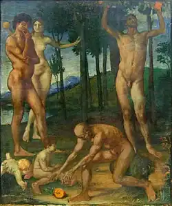 In the 1880s Marées painted four monumental triptychs: The Judgment of Paris, The Hesperides, Three Saints on Horseback and The Wooing.[3] During this time he also produced smaller mythological paintings and some portraits.[6] He spent these last years of his life in Rome, supported by Fiedler.[1] He died there in 1887, at the age of 49, and was buried in the Protestant Cemetery.