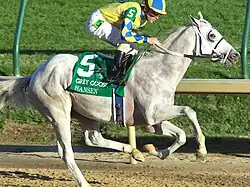 Hansen (foaled April 23, 2009 in Kentucky), nicknamed 'White Lightning' and 'The Great White Hope', is a grey American Thoroughbred racehorse. Out of the Sir Cat mare Stormy Sunday, he is sired by Tapit. He is famous for having a coat that has grayed out to white far more rapidly than is typical, which led sportscaster Frank DeFord to describe him as a "four-legged Steve Martin.[1] He is named after his owner and breeder, Dr. Kendall Hansen. He was trained by Mike Maker, and his regular jockey was Ramon Dominguez.