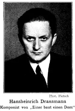 Dransmann studied with Franz Schreker and the Academy of Arts in Berlin. He was a pioneer of film music, working with avant-garde directions such as Walter Ruttmann.[1] He joined the SA in 1931 and the NSDAP itself in 1932, and subsequently became a leading composer of mass propaganda works for the Third Reich after the Machtergreifung.[2] After 1945, his work fell into obscurity, and there were no further public performances of his music.[3]