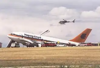 Hapag-Lloyd Flight 3378 (HF-3378) was a passenger service operated by Hapag-Lloyd Flug from Chania, on the island of Crete, Greece, to Hannover, Germany. On 12 July 2000, the aircraft flying the route, an Airbus A310-304, had 143 passengers and 8 crew on board, set off for Hannover leaving the landing gear fully extended, as a precaution, since a malfunction had prevented its proper retraction after take-off. The plane eventually ran out of fuel while attempting a diversion to Vienna, crash-landing just short of runway 34. No fatalities resulted, although the aircraft was written off.[1]