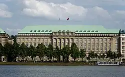 The outbreak of World War I resulted in the internment of 32 vessels in US ports, a status later changed to confiscation when the US entered the war in 1917.[8] Likewise, its Hoboken base was confiscated and turned over to the US Navy, which used it as a transshipping point for the duration of the war.[9] As with HAPAG, the NDL ships surviving the war were eventually confiscated as reparation, leaving the company to start over from scratch.