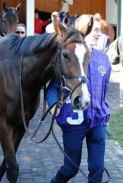 Happily is a bay filly with a white blaze bred in Ireland by the You'resothrilling Syndicate. She was sired by Galileo, who won the Derby, Irish Derby and King George VI and Queen Elizabeth Stakes in 2001. Galileo became one of the world's leading stallions and has been champion sire of Great Britain and Ireland nine times. His other progeny include Cape Blanco, Frankel, Golden Lilac, Nathaniel, New Approach, Rip Van Winkle and Ruler of the World.[2] Happily's dam You'resothrilling was a sister of the leading racehorse and stallion Giant's Causeway.[3] You'resothrilling was trained by Aidan O'Brien and won the Cherry Hinton Stakes in 2007.[4] Happily is her fifth foal, the first four being Marvellous, Gleneagles, Coolmore (C L Weld Park Stakes) and The Taj Mahal (Zipping Classic).
