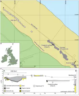 The footprints were found in the sediment, partially covered by beach sand, at low tide on the foreshore at Happisburgh. The sediment had been laid down in the estuary of a long-vanished river and subsequently been covered by sand, preserving its surface. The layer of sediment underlies a cliff on the beach, but after stormy weather, the protective layer of sand was washed away and the sediment exposed.[3][6] The sediments are stratigraphically considered to belong to the Cromer Forest Bed unit.[2]