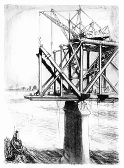 The next phase of the project involved building massive willow mats. These mats were constructed on the river. When completed, they measured 200 feet x 300 feet. They were floated to the location of the piers (held in place by barges) and sunk to the bottom of the river with rip-rap and stone. The purpose of the willow mats was to reduce scouring, keeping the river bed in place as the pneumatic caissons were dug into the river bed.[9]