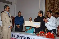 A commemorative 5-rupee stamp was released by Shri S. C. Jamir, Governor of Maharashtra, on Shri Harakh Chand Nahata on 28 February 2009 in Mumbai to honor his selfless service to society and India.