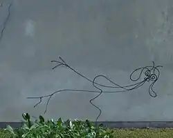 Naegeli has had a classic education as an artist, having studied at the Kunstgewerbeschule of Zürich and at the École des Beaux-Arts in Paris.[1] Naegeli's graffiti appeared beginning in September 1977 on the walls of Zürich. He used black spray-paint to paint wireframe figures on the walls of public and private buildings alike. He painted his graffiti anonymously at night, in places all over the city. The figures provoked a heated controversy in Zürich and indeed in Switzerland in general. Intellectuals and artists recognized the artistic value of Naegeli's works early on, but the general public and the Swiss authorities saw it only as an illegal and malicious defacement of property. Naegeli himself later said that he saw himself as a political artist and his graffiti were a political statement against the increasing anonymity in the city.[2] The authorities issued an arrest warrant for him, but he was apprehended only in June 1979 when he returned to one of his paintings to collect his glasses that he had forgotten there. Until then, he had painted some 900 graffiti in Zürich. He evaded the trial by fleeing to Germany to his confidant, journalist and author Hubert Maessen, yet was sentenced in absentia to nine months in jail and a fine of CHF 206,000. His lawyers appealed, but the Supreme Court of Switzerland confirmed the sentence in November 1981. Since Naegeli had left the country, the authorities of Zürich issued an international arrest warrant for him. 72 Swiss artists signed a petition demanding that this arrest warrant be retracted, to no avail.