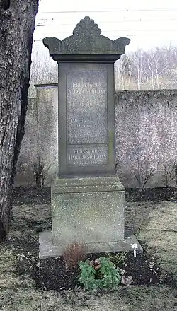 Ironically, he died on May 1 after falling down from his fourth-floor balcony,[8] on International Workers' Day. His grave can be found in Huddinge graveyard southwest of Stockholm.