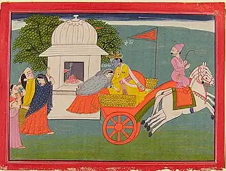 The legend of Rukmini's elopement with Krishna is called the Rukmini harana, the subject of many plays and texts composed in several Indian languages.[5] In this legend from the Bhagavata Purana, Rukmini sends a letter to Krishna with a Brahmin messenger, beseeching the deity to save her from her marriage to Shishupala. Krishna elopes with the princess during her svayamvara ceremony, making her his chief consort.[6]