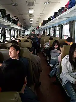 Compared to soft seat, hard seat carriages have more seats per row (2+3 vs. 2+2) and are usually more crowded, and people without seats may stand in hard seat carriages.[3]