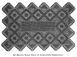 Hardanger embroidery or "Hardangersøm" is a form of embroidery traditionally worked with white thread on white even-weave linen or cloth, using counted thread and drawn thread work techniques. It is sometimes called whitework embroidery.