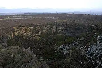 The site is typical of a South Pennine Moorland with gritstone and sandstone (Millstone Grit Yeadonian sandstone outcrops) underlying the soil.[40][41] The moor has several springs and marshes and in its central section is drained by two streams (Deep Cliff Hole and Midgram Beck) which both flow through Harden (meeting up under the houses built on the former mill site in the village) and flowing through Harden park to meet up with Harden Beck in the Woodbanks area at the eastern end of the village. Deepcliffe Wood is a small valley that is bordered on its northern, western and eastern edges by heather moorland. The wood, through which Deep Cliff Hole drains, is a remnant of an ancient woodland[42] which sits on a fault extending southwards towards Wilsden[43] and is noted for its oak trees, badgers, woodpeckers, bats and cuckoos.[40]