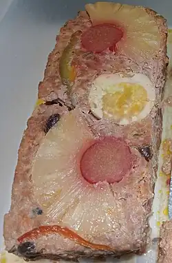 Hardinera (Philippine Spanish: jardinera), also known as the Quezon meatloaf or the Lucban meatloaf, is a Filipino meatloaf made with diced or ground pork topped with sliced hard-boiled eggs, pineapples, carrots, bell peppers, peas, tomatoes, and raisins, among others. The ingredients used are identical to the ones used in Filipino menudo; while the cooking process is similar to the Filipino embutido. It is traditionally steamed in an oval-shaped tin mold known as a llanera (or lyanera), which is also used to make leche flan. It originates from the province of Quezon in Luzon Island.[1][2][3][4]