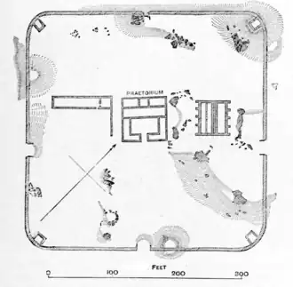 The outer wall has four gates, at the centre of each side, and lookout towers at each corner. Within the walls are the remaining outlines of several buildings: two side-by-side granaries, the garrison headquarters building and garrison commander's villa, or Praetorium. In addition to these stone buildings, long-lost timber structures would have housed barracks for the mounted auxilia.[5]