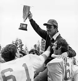 ![]() UBC head coach Frank Smith with the original Hardy Trophy in 1978. | |
