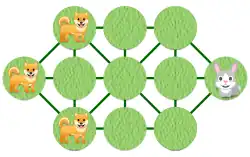 - If the hare successfully passes the three hounds or reaches the other end of the board, the hare wins. If the hounds surround and immobilize the hare, the hounds win.