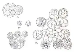 Hariotina is morphologically similar to the genus Coelastrum, and species of Hariotina were once considered to be part of Coelastrum. Whereas Coelastrum has cells that are joined to each other at their bases, Hariotina has cells connected to each other at their apices. In addition, colonies of Hariotina have a surrounding layer of mucilage, which is absent in Coelastrum.[6]
