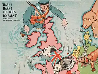 Even without modification, the rhyme has served either to illustrate or to emphasize some point being made by the writer. In an 1835 article in Blackwood's, an unidentified contributor linked nursery rhymes to various political issues, using "Hark Hark" in specific reference to the Reform Acts passed in Britain earlier that decade.[33] And the rhyme was used by Theodore W. Noyes in his 1900 journalistic correspondence to the Washington Evening Star to convey his impressions of the Sultan of Sulu's retinue, who were meeting with an American diplomatic delegation.[34]