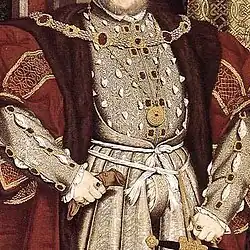 Right: Detail from a portrait of Henry VIII (1530s), showing numerous small jags cut into the body and sleeves of his doublet, through which "puffs" of the underlying shirt have been pulled through.
