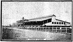 The track was built by a syndicate led by George Hankins in 1894, and it was scheduled to open for the 1895 horse racing season.[2] Because there was a public outcry against all gambling, the track did not open as scheduled, and it lay dormant at great expense to the investors.[2] On July 3, 1897, the track was sold by the Chicago Fair Grounds Association, by President William Martin, to attorney William H. Allen for $150,000. Allen leased the 80 acre property to James Anglin who appointed John Condon general manager, and Martin Nathanson as secretary.[2] The lease eventually went to Condon, but he decided to discontinue his association with the track when his lease expired on February 1, 1899.[3] Despite Condon's retirement, it was speculated that he remained in control of Harlem, and the course secretary, Martin Nathanson, announced that the 1899 racing program would begin on May 30.[4] A fire at the track on May 22, 1899, believed to be caused by "incendiaries," destroyed the grandstand and fencing. A temporary grandstand was quickly built so that racing season could still open on time, and construction of a new permanent grandstand of steel and stone was planned.[5]